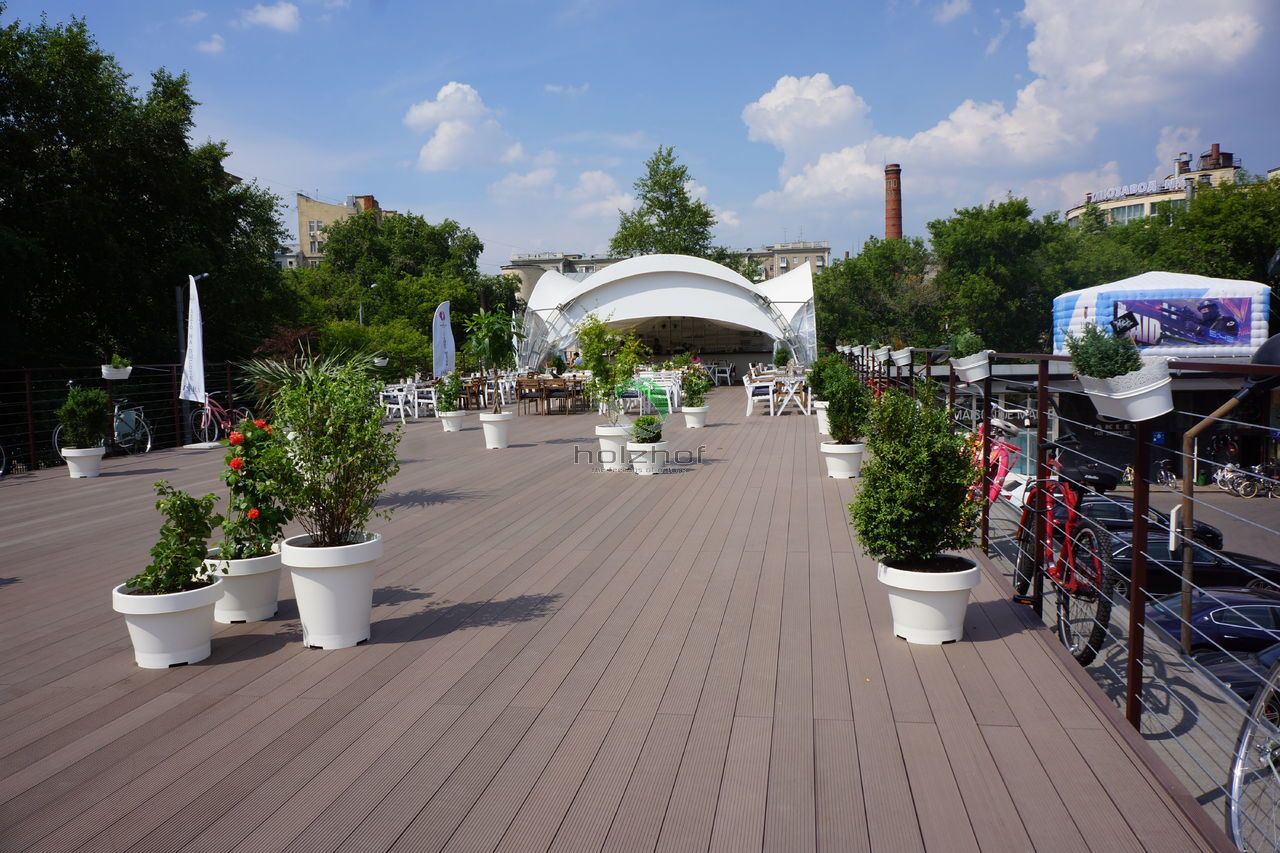 Проходимость с барах Москвы очень большая, и не каждое покрытие пола выдержит бурные выходные с танцами девушек на каблуках. В кафе - бар «Искра» смонтирована качественная террасная доска, которая выдержит не только большой поток посетителей, танцы на каблуках но и погодные перемены на открытой террасе. Проведя предварительную работу, была выбрана шовная террасная доска на регулируемых опорах , отлично подходящая по всем характеристикам. Теперь посетители бара, смогут весело и комфортно отдыхать.